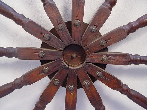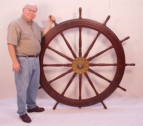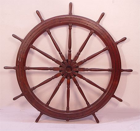 HUGE 19TH CENTURY SHIPS WHEEL: 5 ft 7 in. diam. With 12 spokes centering an ornate brass hub.