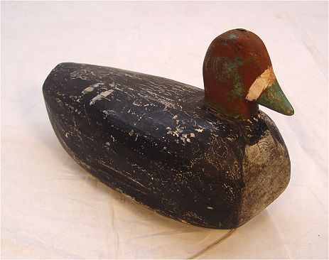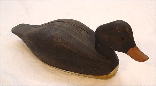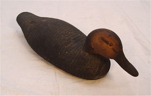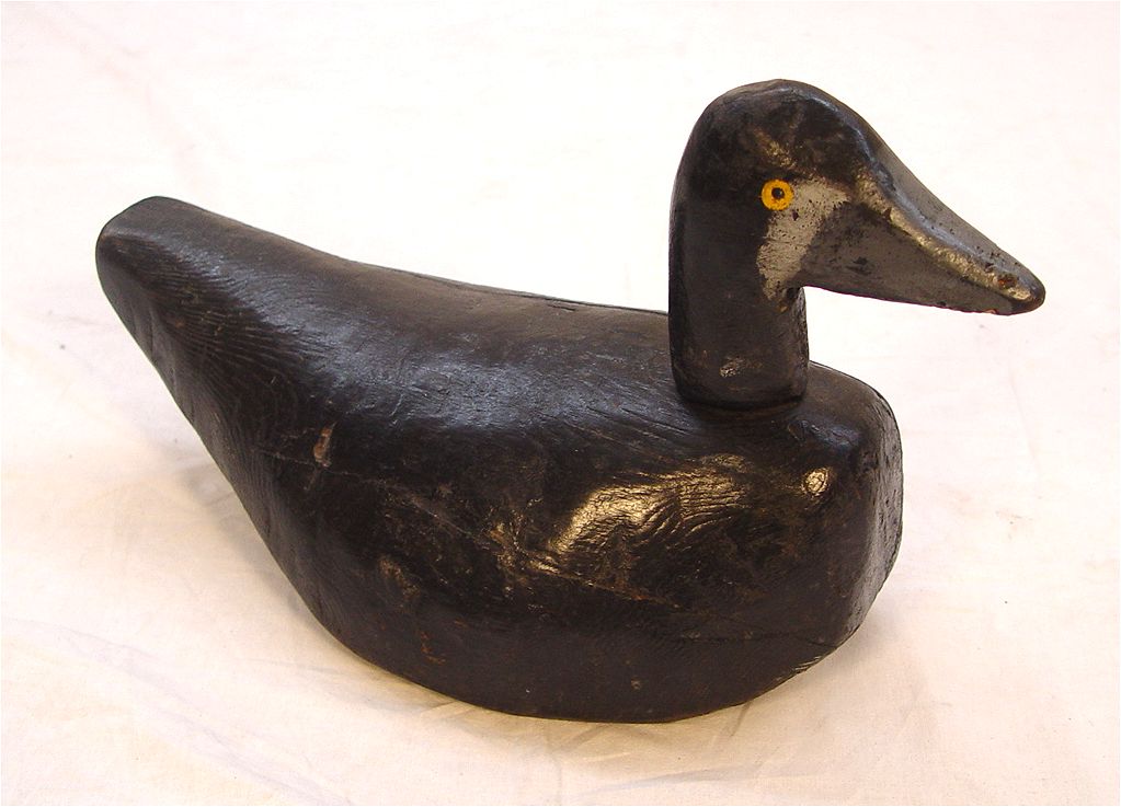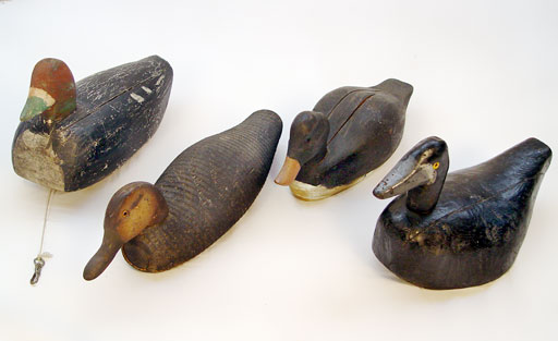 4 CARVED DUCK DECOYS: All have an original dark finish, 2 have glass eyes, 2 have necks that pivot, 13-16''l.