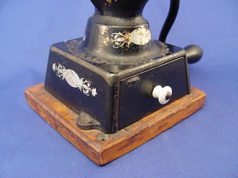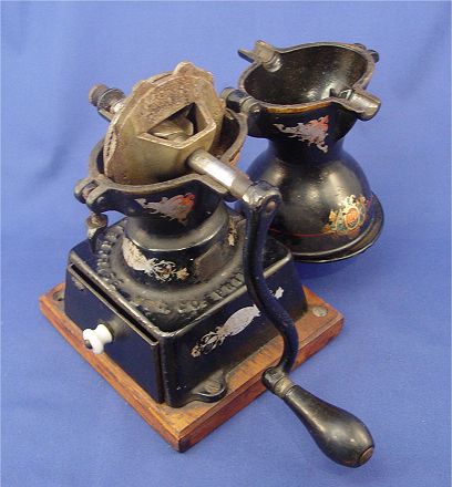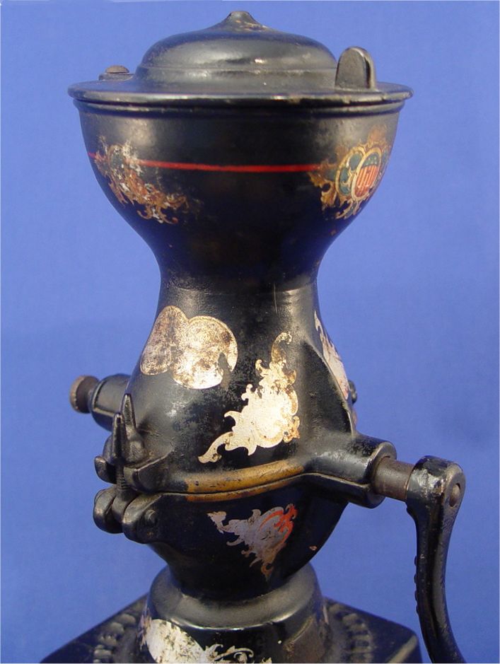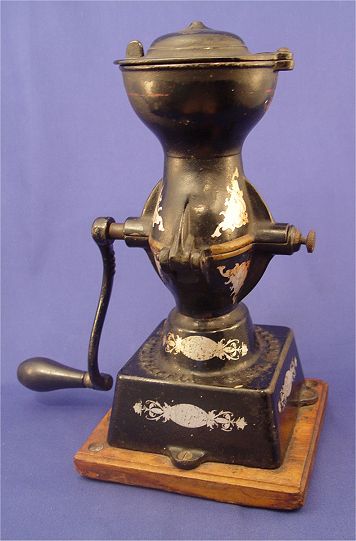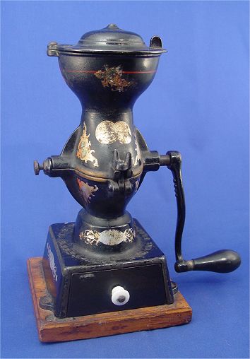 ENTERPRISE NO. 1 COFFEE MILL GRINDER: With original decals. Embossed along the base is ''Enterprise Mfg Philadelphia USA''. Under the lid is ''1 2157''. On wooden base it stands 13''h.