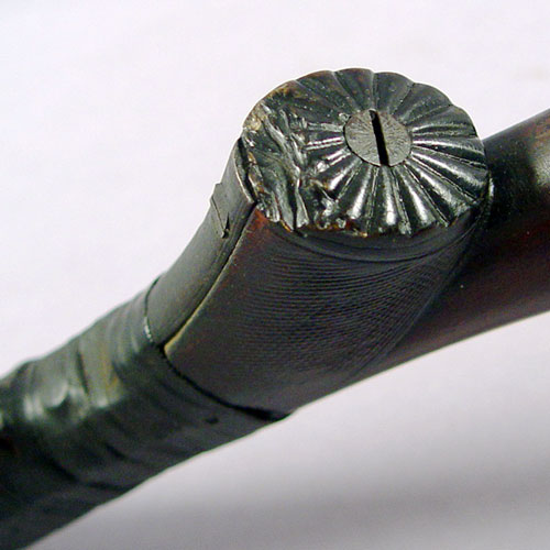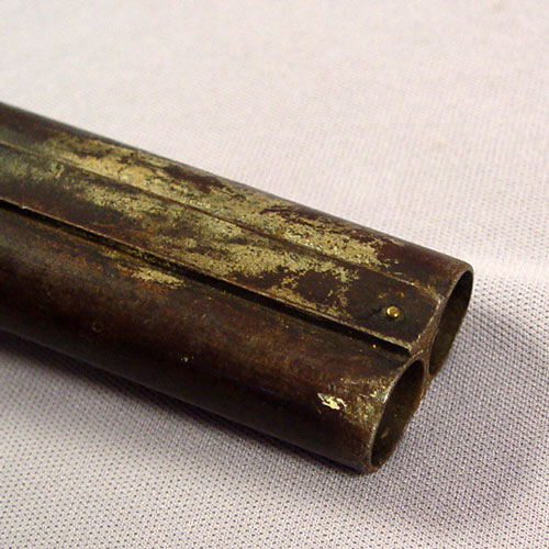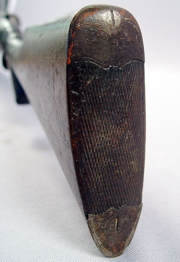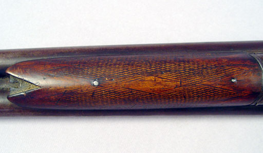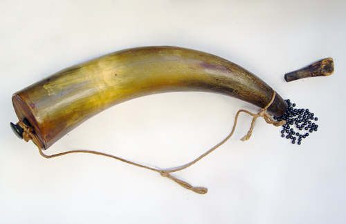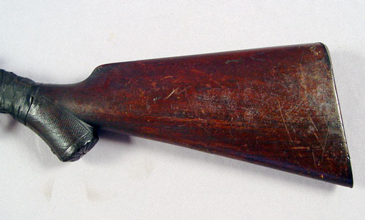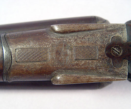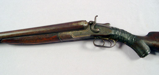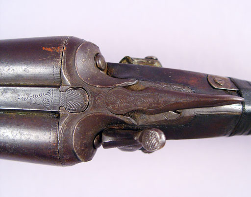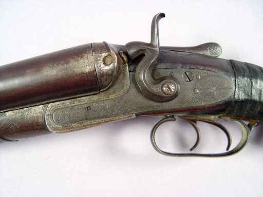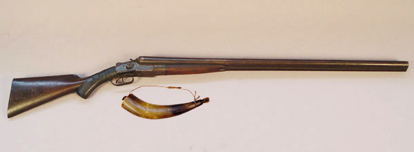 SAMUEL BUCKLEY & CO DOUBLE BARREL SHOT GUN: Lovely etch work of ducks to metal, London Laminated Steel marked on bar between barrels, one hammer broken off, very old tape repair to the grip. 32'' barrel, approx. 49''l. overall. Sold with a powder horn.