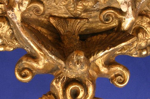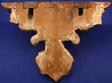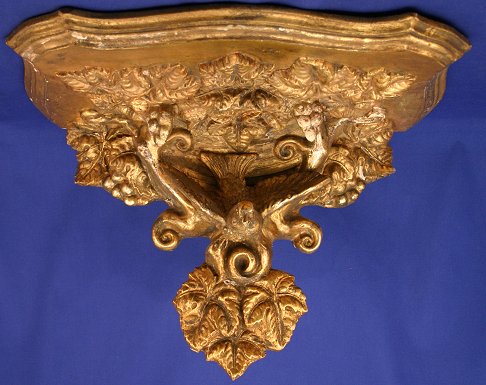 19TH C. CARVED AND GILDED GESSO AND WOOD WALL BRACKET WITH BIRD, LEAF AND BERRY MOTIF: 11'' h., 16'' w., 10'' d., dovetailed construction, overall wear with missing gesso and patina loss.