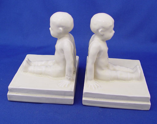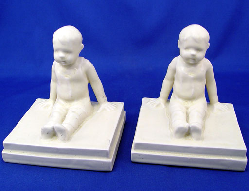 ROOKWOOD POTTERY ''LITTLE BOY'' BOOKENDS: Matt white, marked with the Rookwood logo, shape number 2447, and the date mark for 1920. Please note very small chip on one (back right corner). 5 1/4''h, the base is 5'' x 4 1/8''.