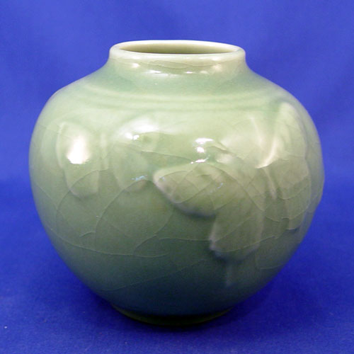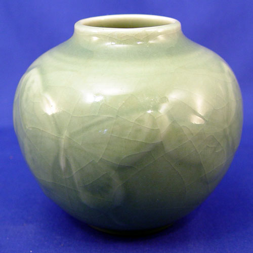 ROOKWOOD POTTERY BUTTERFLY VASE: Designed by Shirayamadani, green crackle glaze, Marks include the Rookwood logo, shape number 6309, and date mark for 1944. 4 1/2''h.