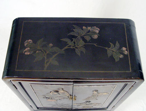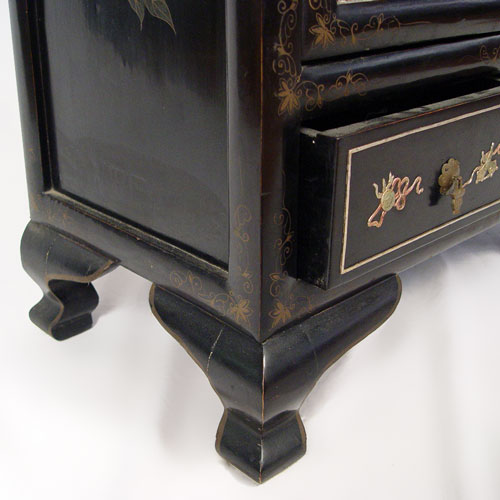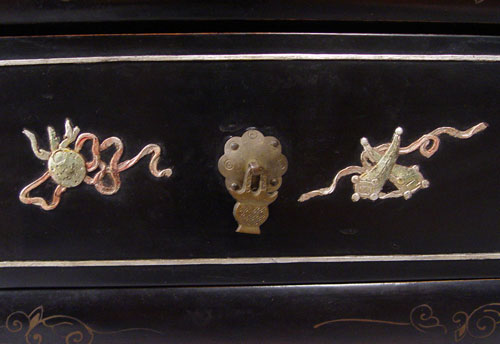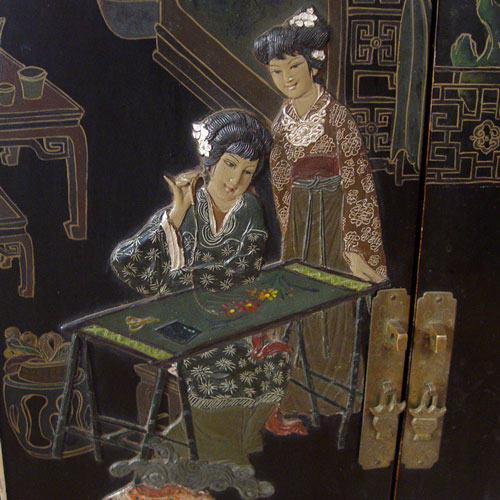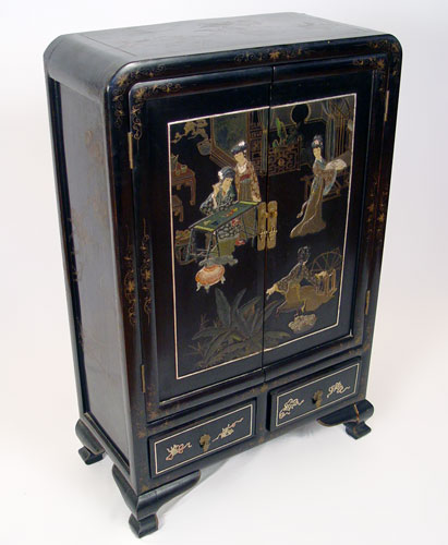 CHINESE TURN OF THE CENTURY CABINET: Two door black lacquer cabinet with raised images on the double doors, 2 half length drawers across the bottom, shelved interior, 41'' x 25'' x 13''.