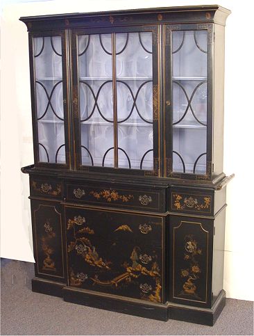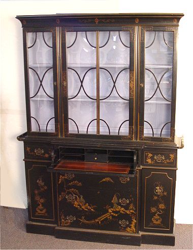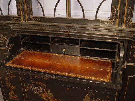 CHINOISERIE DECORATED SECRETARY CHINA CABINET: Mid 20th C. China cabinet upper section with blue painted interior slightly curved glass on the doors. Fall front secretary drawer with leather writing surface on the lower section. 74''h. x 54 1/2'' x 14''.