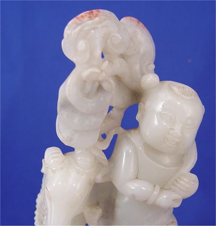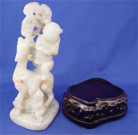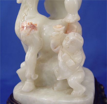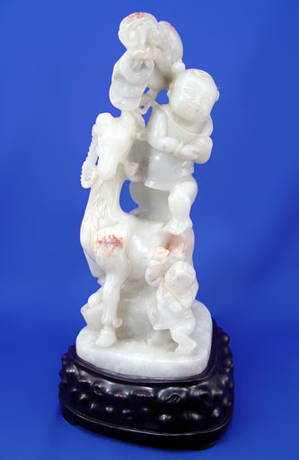 FINE CHINESE CARVED CELADON JADE FIGURAL RAM AND CHILDREN GROUP: Jade is 11''h, 5 1/2'' dia. Sold with the wooden stand. Est. $800/1200**