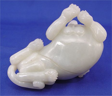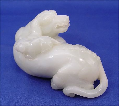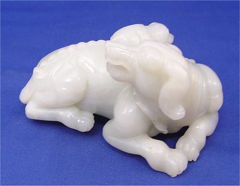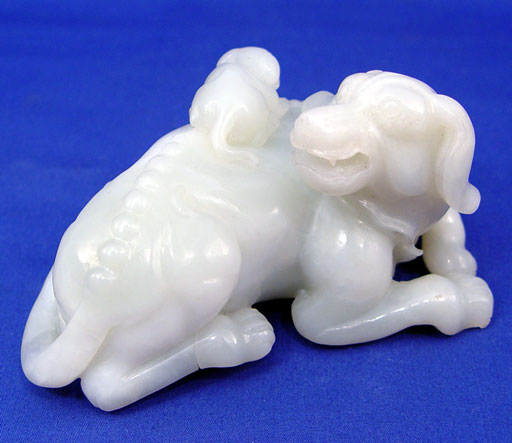 CHINESE CARVED CELADON JADE STUDY OF DOGS: Jade is 3''h, 6'' l. Sold with the wooden stand. Est. $600/800**