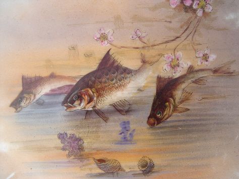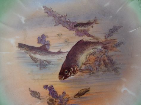 FRENCH LIMOGES FISH SET: Ca. 1891-1914. 7 hand painted fish decorated plates, sauce boat and underplate. Bears the Coiffe and SW Biarritz marks. Plates are 10'' dia., the sauce boat is 7''. Please note there is wear to the gold and outer rim of the fish scenes, free of chips or cracks.
