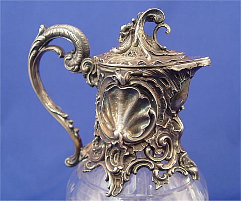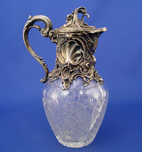 GERMAN SILVER MOUNTED CUT GLASS PITCHER: Rococo silver mounting, hinged lid, and handle. Please note the glass is cracked. 10''h.