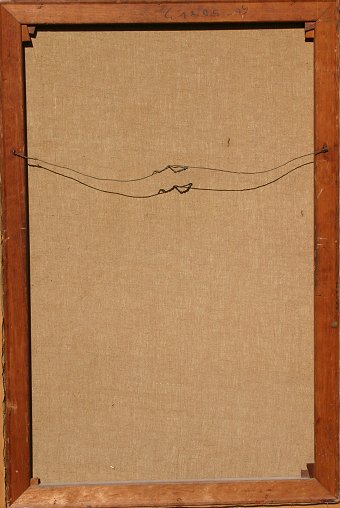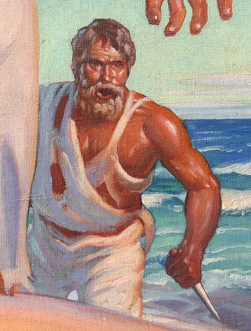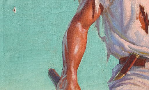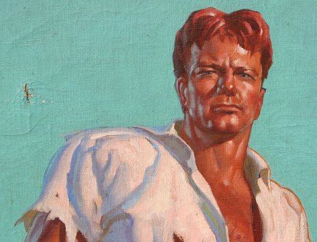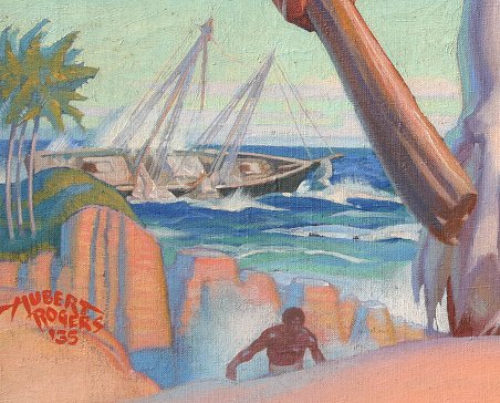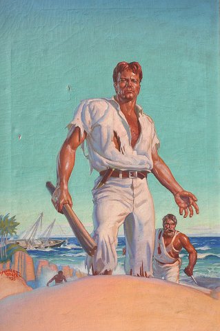 ROGERS, Hubert, (American,1898-1982: Adventure Pulp Magazine Illustration Depicting Shipwreck Survivors, O/C, 36'' x 24'', signed and dated '35, gold frame, 38'' x 26'', Adventure written in pencil verso on the stretcher along with several numbers. Several repairable small tears. Est. $3000/5000**