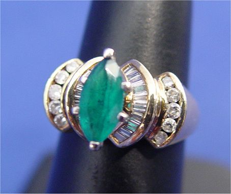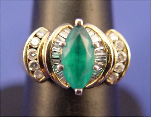 EMERALD & DIAMOND RING: 1ct emerald in a marquise cut set in 14k gold with round and baguette cut diamonds, size 6.25, 5 grams.