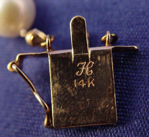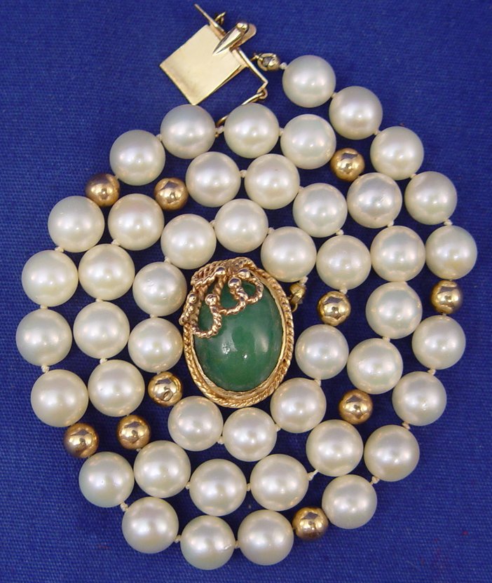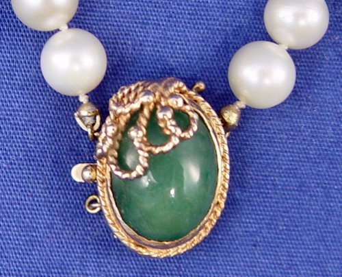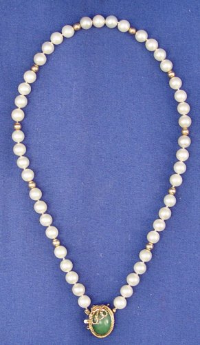 18'' STRAND OF 7.7MM PEARLS: Creamy white pearls with 5mm gold bead separators, jade cabochon pressure clasp with safety, 14k.