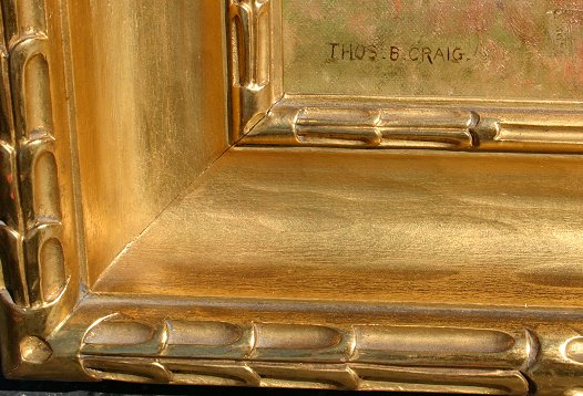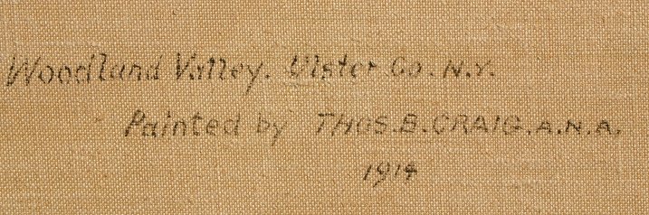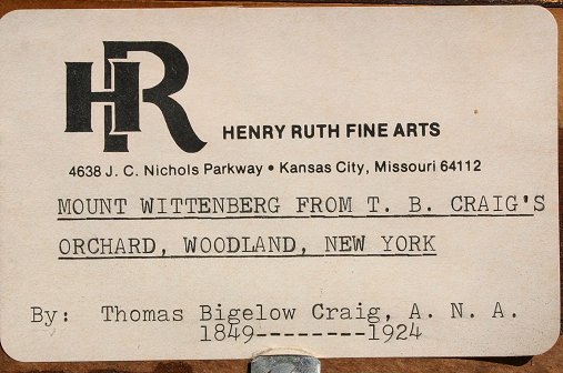 CRAIG, T.B., (American, 1849-1924): ''Mount Wittenberg from T.B. Craig's Orchard'', Woodland, NY, O/C, 18'' x 26'', signed, original Karcher and Rehn framing label with hand written title, Henry Ruth Fine Arts label, titled again on canvas verso, ''Woodland Valley, Ulster Co., NY, 1914'', superb carved gilt frame, 24'' x 32''. Dodderidge Collection Est. $2000/4000**