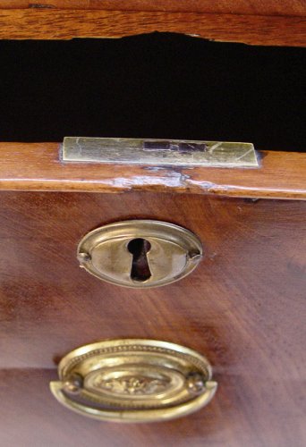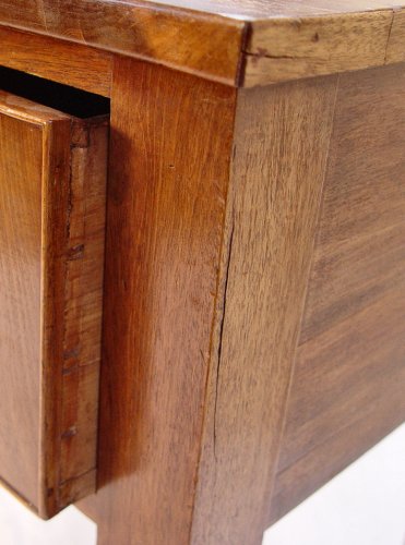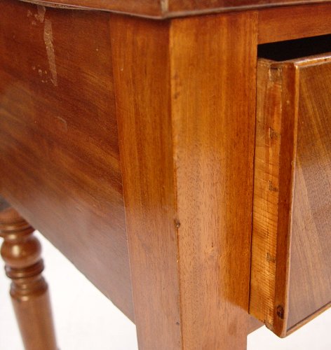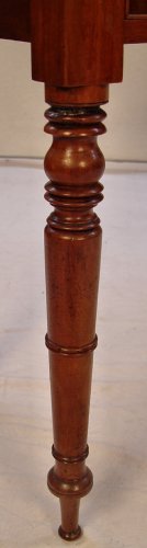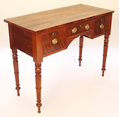 EARLY 19TH C WRITING DESK: Three drawer desk, chamfered drawers with dovetail construction, replaced brass pulls, refinished condition. 32''h. x 42'' x 19''.