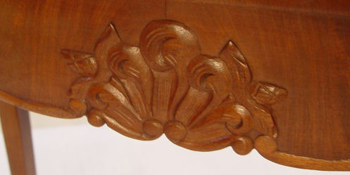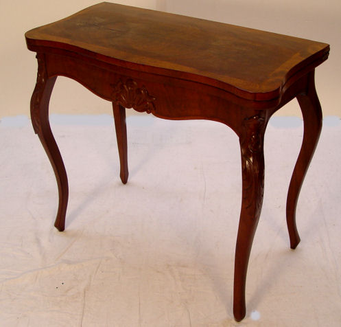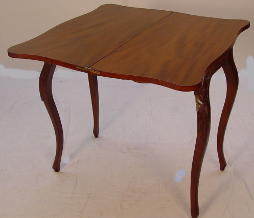 EARLY 20TH C CHIPPENDALE STYLE MAHOGANY GAME TABLE: Banded and shaped top, carvings on the apron and the cabriole legs. 30''h., 32'' square when leaf is open, 16 1/2'' deep when closed.