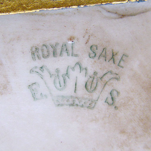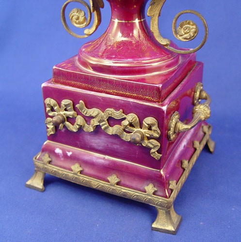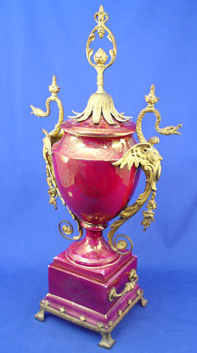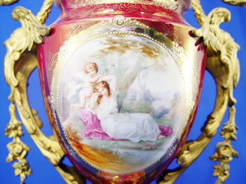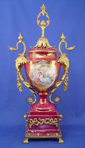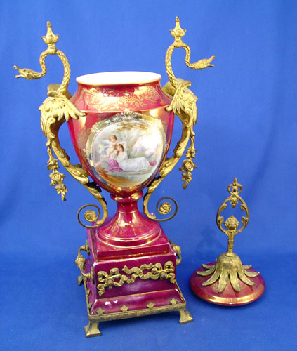 ORMOLU MOUNTED ROYAL SAXE PORCELAIN COVERED URN: Crowned eagle form mounts, centered by a vision of Cupid and Venus. 18 1/2''h. overall.