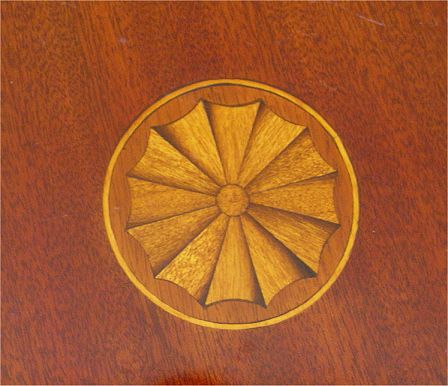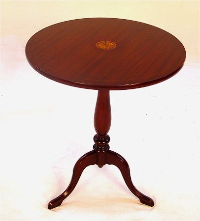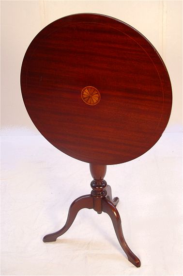 MAHOGANY INLAY TILT TOP TEA TABLE: Round top centering an inlay patera, tri-pod legs ending in snake feet. 22'' dia., 27''h.