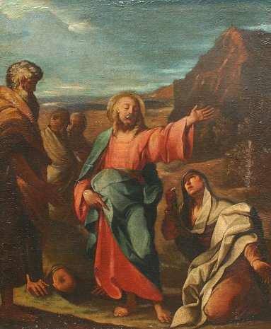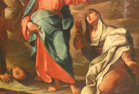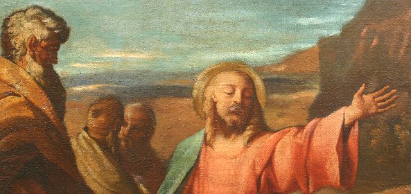 EARLY OLD MASTER RELIGIOUS PAINTING DEPICTING JESUS AND HIS FOLLOWERS: 34'' x 28'', O/C, contemporary frame, 39'' x 34'', no visible signature, of very good quality. Older reline, cracklure throughout, some paint flecks with scattered inpaint.