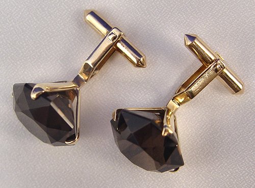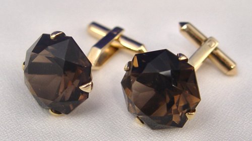 18K GOLD SMOKY QUARTZ CUFF LINKS: Deep brown stones measuring approx. 18 x 12mm, set in 18k yellow gold cufflinks, approx. 15 grams.