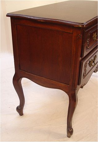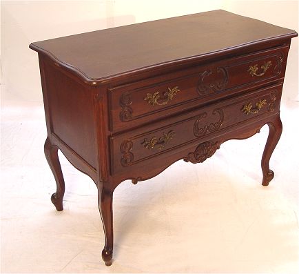 FRENCH COUNTRY OAK COMMODE: Two full length drawers, shaped skirt, cabriole legs. 40''w x 19''d x 31 1/4'' h