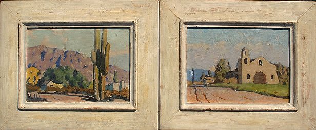 ATWOOD, Robert, (American, 1892-1970): Taos Mission, Desert Scene, O/CB, 5'' x 7'', unsigned, framed, 8 3/4'' x 10 1/2''. Several paint flecks.