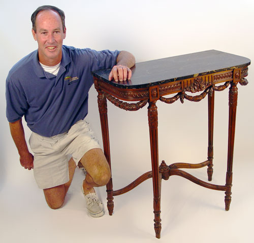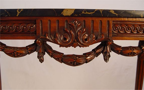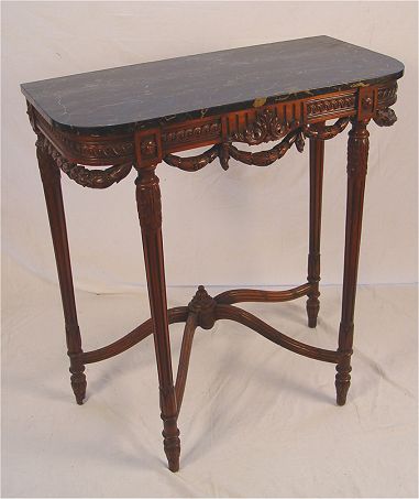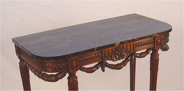 BLACK MARBLE TOP FOYER TABLE: Carved base with draping swag under the carved apron, curved stretchers, join at finial. 37.5''h. x 33.5'' x 17.25''. Please call for condition.