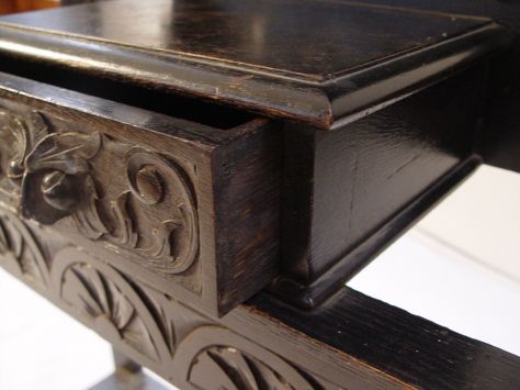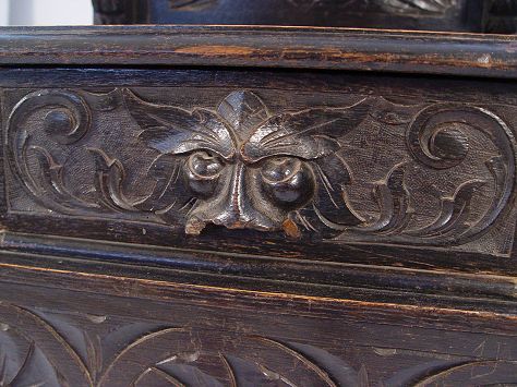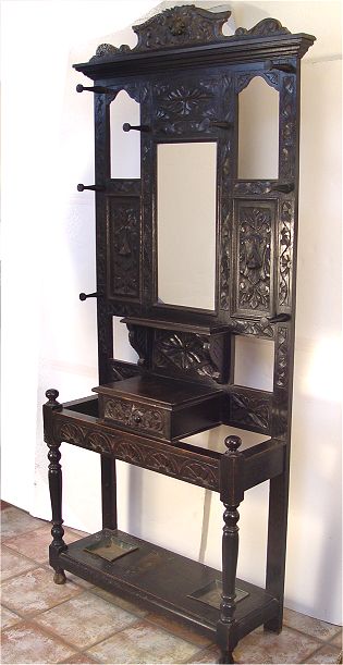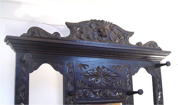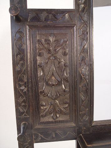 DARK OAK CARVED HALL STAND: Central mirror surrounded by carved panels, lions head pediment and drawer pull, 9 wooden coat or hat pegs. Metal umbrella drip pans in the boot shelf. 36 1/4'' w x 13'' d x 80 1/2'' h