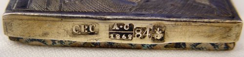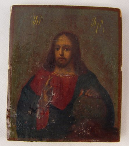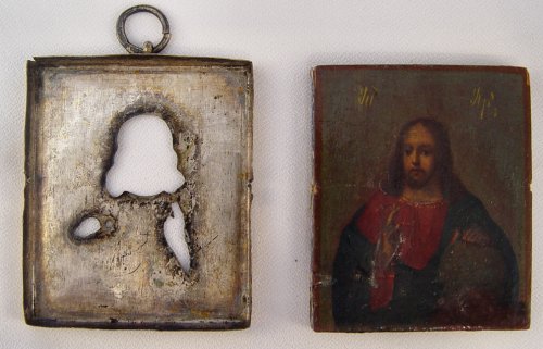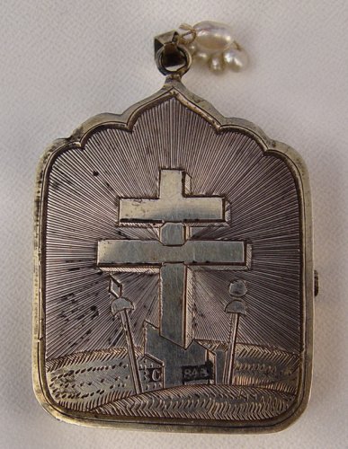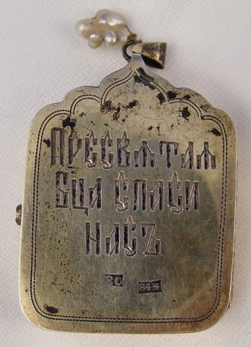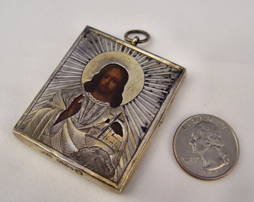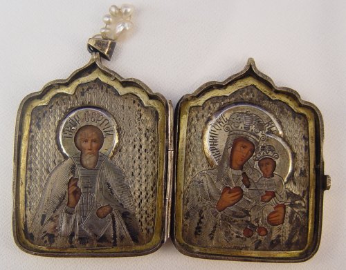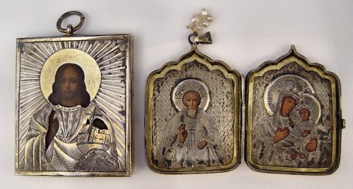 RUSSIAN ICON PENDANTS: Two personal size icons. A pierced silver oklad over painting on wood panel, bottom edge of silver frame marked C.B.C A.C over 1869 84 (zolotnik) Moscow town mark, A.C possibly assayer A Svyechin, C.B.C unknown master 1862- Moscow, 2'' x 1 5/8''. And a double locket marked BC 84 (zolotnik) & Moscow town mark, image of saint in the front cover and Madonna and Child in the back, approx. 2'' x 1 3/8''. Mark information as found in Geoffrey Watts Russian Silversmith's Hallmarks.
