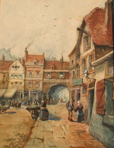 CARTER, F.A., (European, 19/20th C.): Street Scene with Figures, 20'' x 16'', signed and dated '93, gold frame 22'' x 18''.