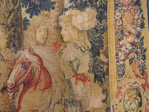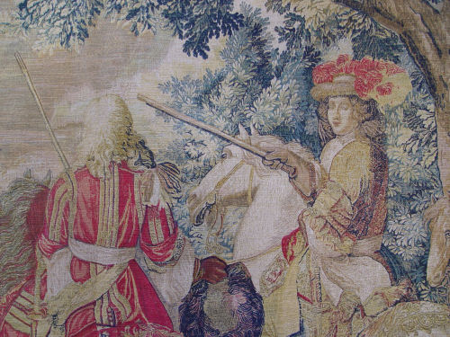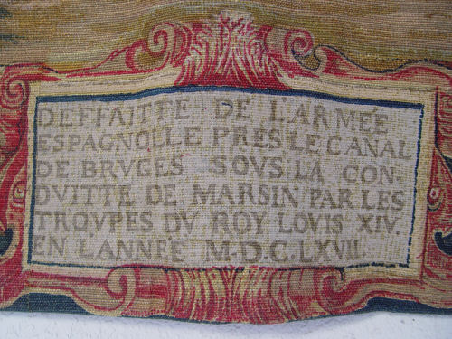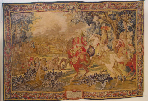HUGH FRENCH TAPESTRY DEPICTING LOUIS XIV MILITARY DEFEATING THE SPANISH: French reproduction of a classic tapestry, ready for hanging. 5'11'' x 8'6''.