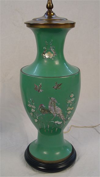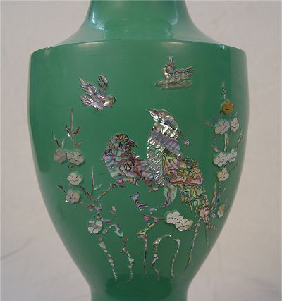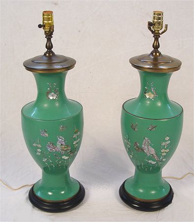 JAPANESE MOTHER OF PEARL CLOISONNE VASES: Mounted as lamps, the vases themselves are 18''h.