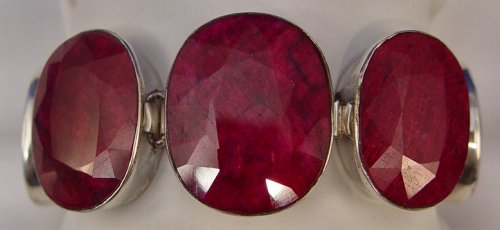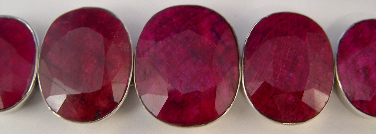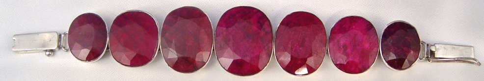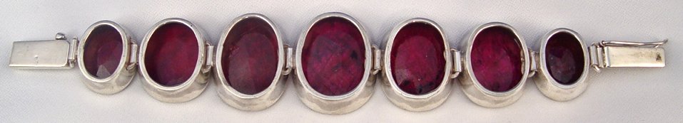 234CTW NATURAL RUBY BRACELET SET IN STERLING: 7 oval stones measuring approx. 25 to 42cts each, bezel set in sterling, pressure clasp with safety latch, marked 925, 7 1/2''l., 85.9 grams.