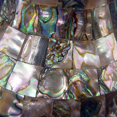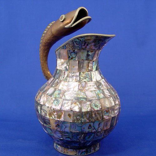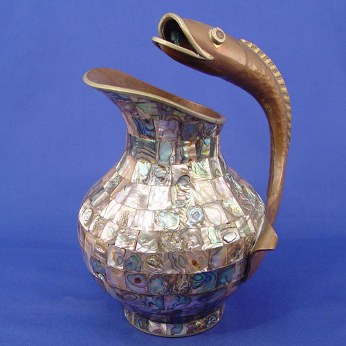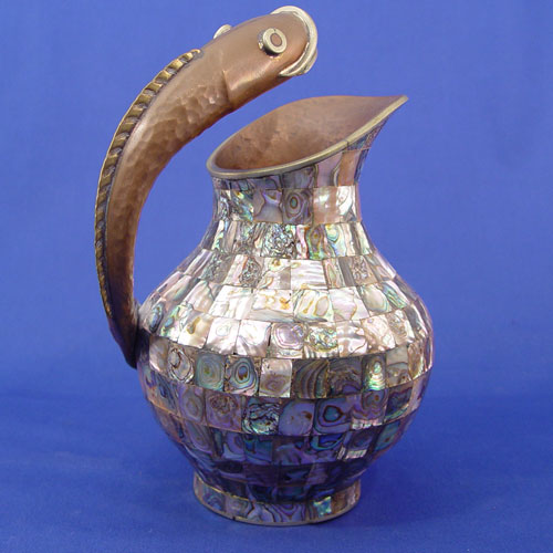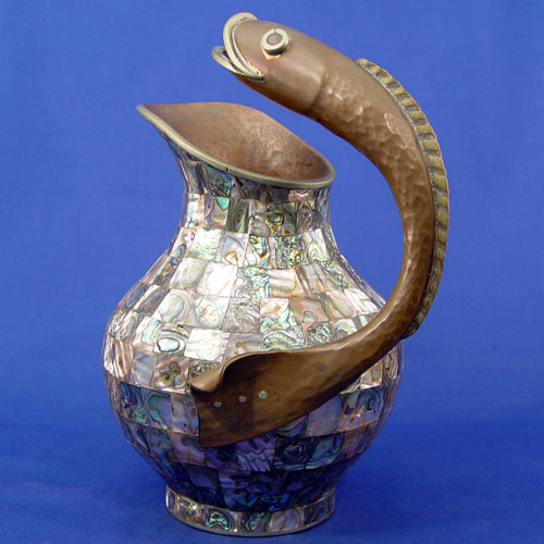 HAMMERED COPPER AND ABALONE MOSAIC PITCHER: With handle in the form of a fish, 9 1/2''h.