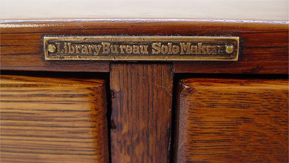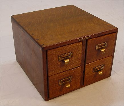 LIBRARY BUREAU TIGER OAK FILE BOX: 4 drawers hold 4 x 6 cards. Refinished condition, 15 3/4'' x 15 1/2' x 16''.