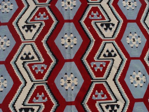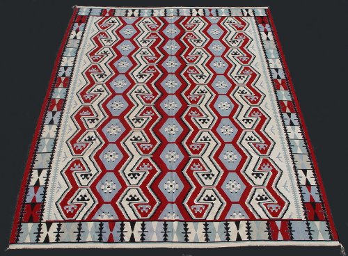 LARGE KILIM HAND WOVEN CARPET: Geometric design, black and red on white ground, approximate size 11'4'' x 8'3/4''. Used condition, could use a cleaning.