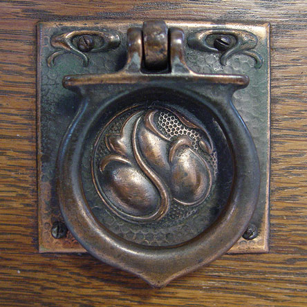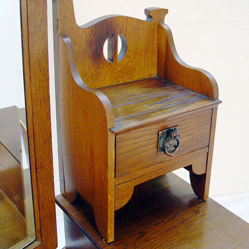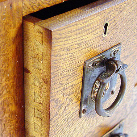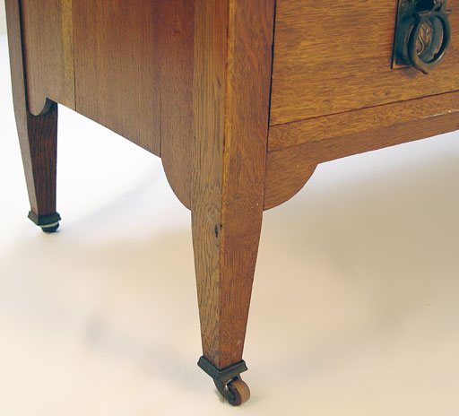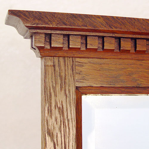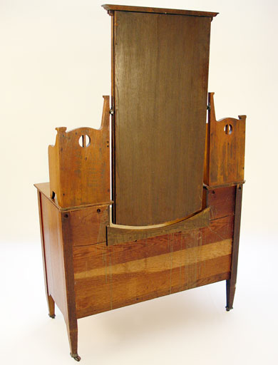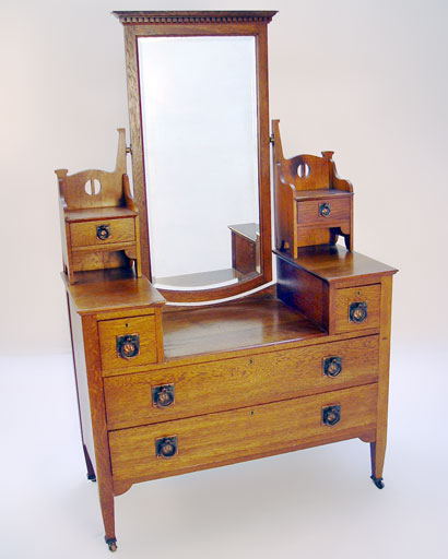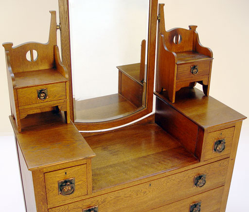 AN ARTS & CRAFTS / NOUVEAU TRANSITIONAL OAK DRESSER: Drop center under a beveled mirror with dentil molding, glove boxes and full length drawers. 66/5'' x 4.5'' x 17.75'' overall.