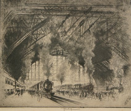 PENNELL, Joseph, (American, 1857-1926): Grand Central Station, Etching, 10 1/2'' 12 1/2'' sight size, pencil signed, framed, 18'' x 20''. Thymolized, area around impression looks distressed. Est. $800/1200**