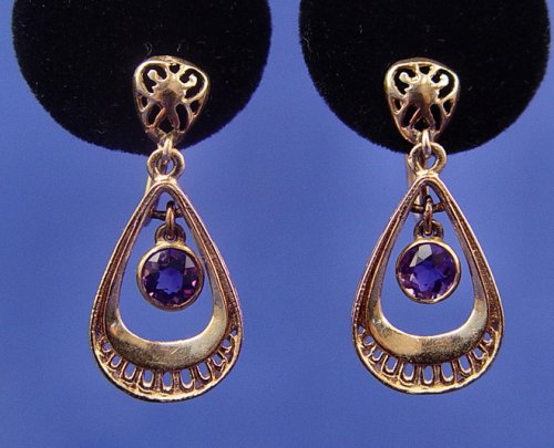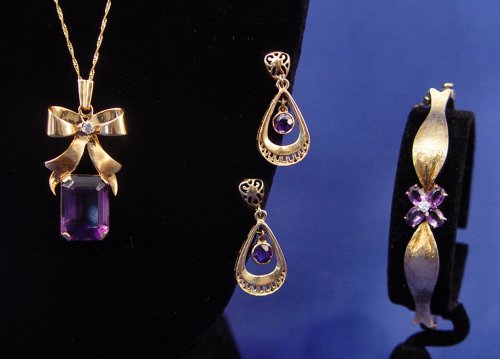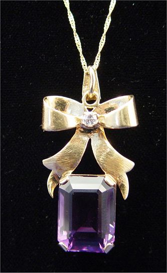 ESTATE LOT OF 14k GOLD AND AMETHYST JEWELRY: To include, hinged bangle bracelet, set with four oval cut amethyst and one tiny diamond, opening approx. 2 1/8'' x 2 1/2'', pressure clasp with safety chain, 15.5 grams; ribbon pendent set with tiny diamond and supporting the emerald cut amethyst, approx. 11.5 x 15.5 x 8.5mm, 1 1/2''l., currently on an 18'' gold chain, 6.5 grams; and a pair of screw back dangle earrings centered by round brilliant cut amethyst of approx. 5 x 3.5mm, 5 grams. Sold as a lot.