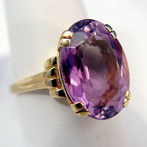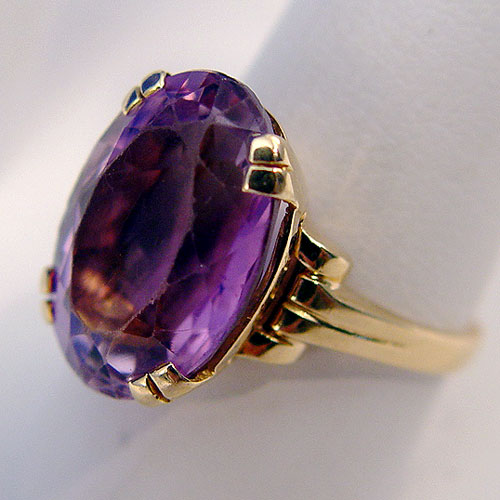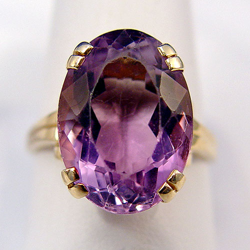 ESTATE AMETHYST RING: Lovely large stone in a brilliant oval cut, approx. 15 x 18 x 9.5mm, please note abrasions to top and edges, set in 14k yellow gold, acid tested, illegible designer stamp possibly TJ18, size 10.5, 7.3 grams.