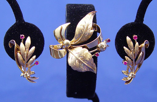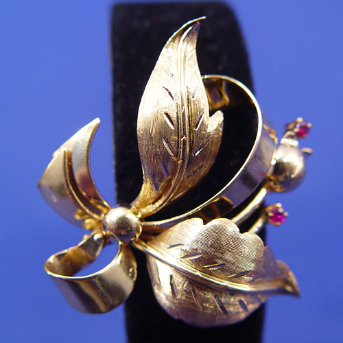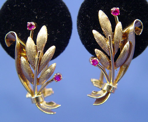 18K ITALIAN GOLD BROOCH AND EARRING SUITE: Lovely foliate motif brooch and omega clip earrings of 18k yellow gold, set with tiny ruby accents. Brooch with bar pin closure, approx 1 3/8'', earrings with clip backs approx. 1 1/8''l., all marked 18k Made in Italy, approx. 13.5 grams overall.