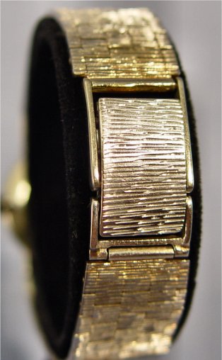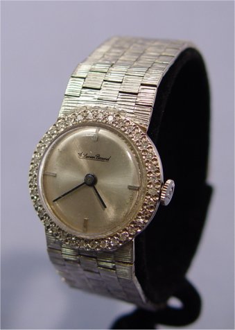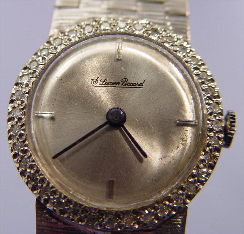 LADIES LUCIEN PICCARD 14K WHITE GOLD WRISTWATCH: Attached mesh bracelet to round watch case edged in clear faceted stones, marked 14k verso and inside case, 17 jewel works marked LP40B 149380, case marked 14k 2133, spots shown are on dial surface, 7 1/4''l, adjustable clasp, currently keeping time.