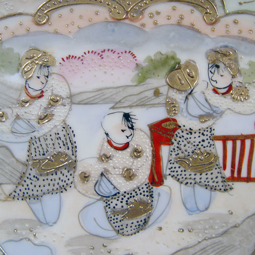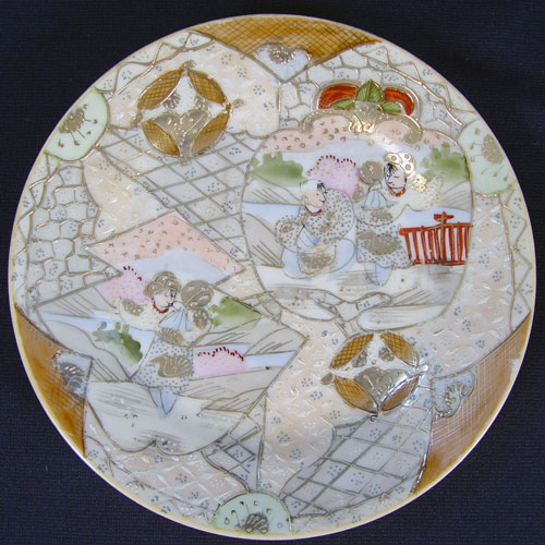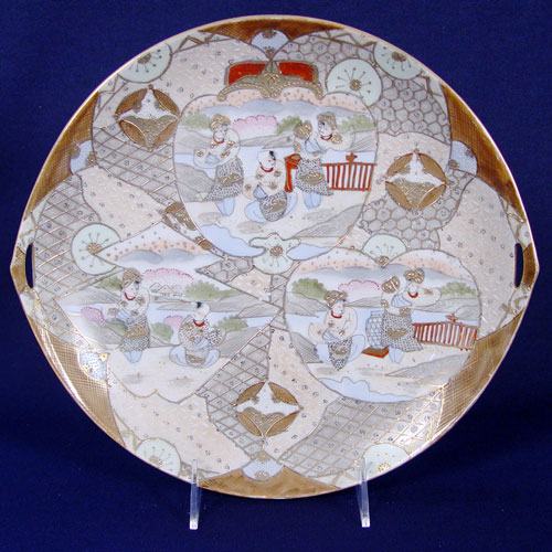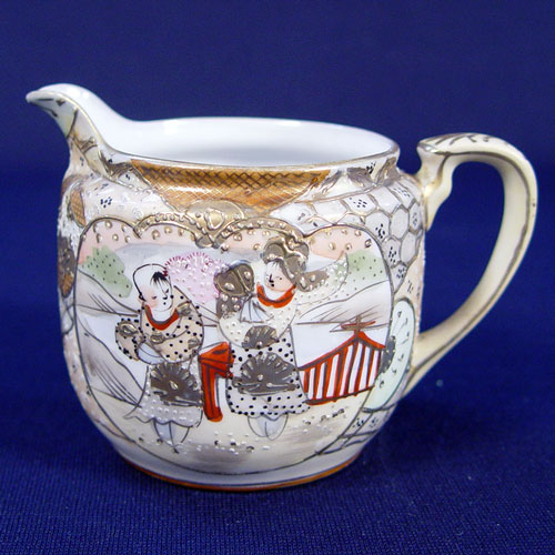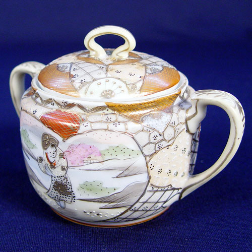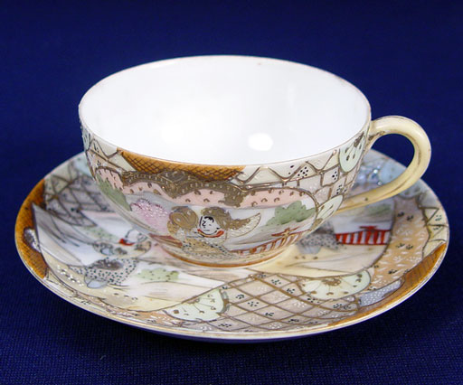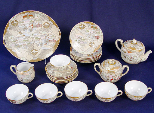 NIPPON ROYAL SATSUMA TEA & DESSERT CHINA SET: 22 pieces of fine hand painted china to include teapot, covered sugar, cream pitcher, pierce handle cake plate, 6 individual cake plates, 6 cups and 6 saucers. Marked ''Royal Satsuma Nippon''.