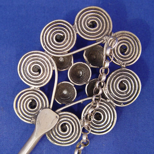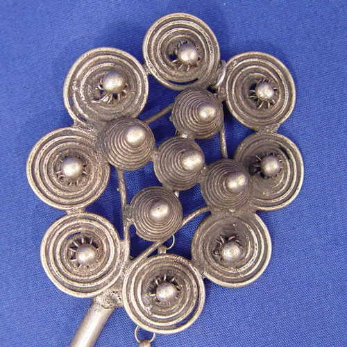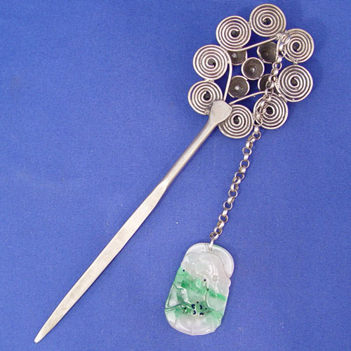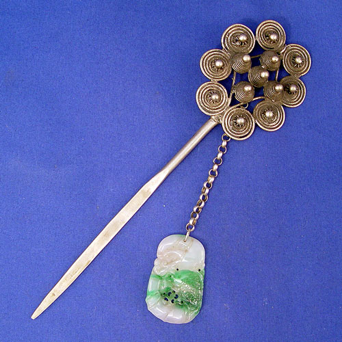 CHINESE SILVER HAIR ORNAMENT: With carved fe-chi jade bobble. 8 1/2''l. Est. $300/500**