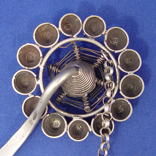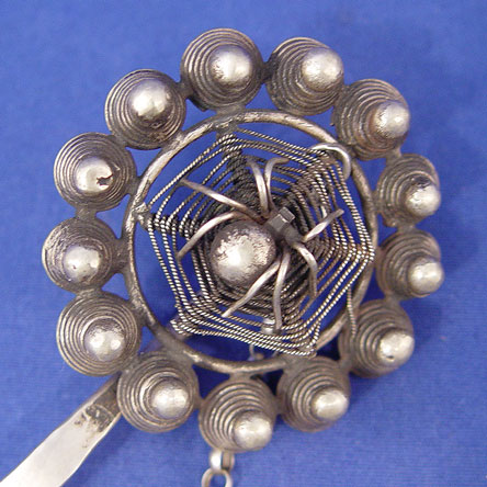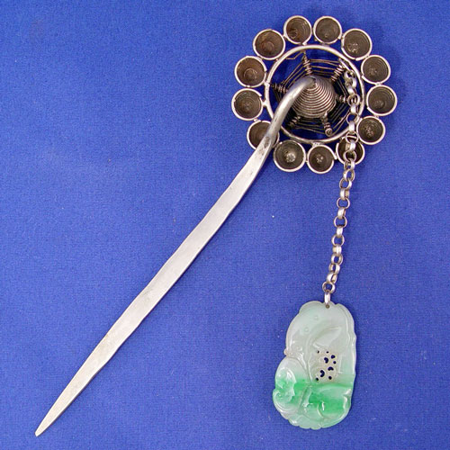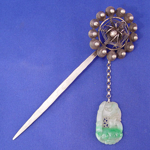 CHINESE SILVER HAIR ORNAMENT: Center decorated with a spider, carved fe-chi jade bobble. 8 1/2''l. Est. $300/500**