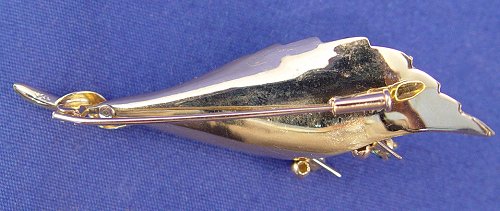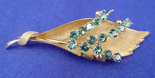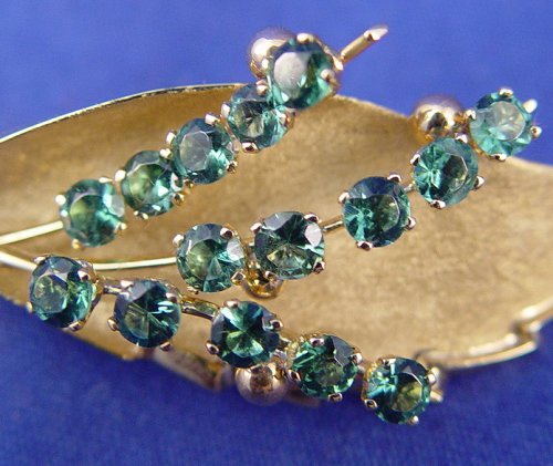 18K GOLD AND TOURMALINE FOLIATE BROOCH: Lovely pin of 18k yellow gold in the shape of a leaf with 15 teal color tourmaline set as blossoms, marked 18k, 2 5/8''l., 10.9 grams. Est. $400/600**