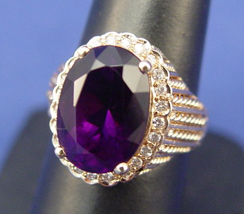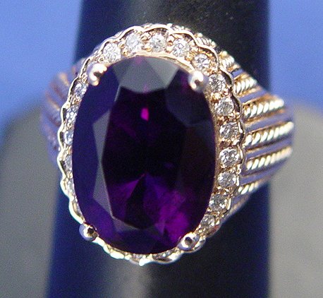 5.88ct AMETHYST AND DIAMOND RING: 14k yellow gold ring featuring a deep purple amethyst, measuring approx. 9.9 x 14 x 4.5, surrounded by ring of small diamonds, approx. .25ctw, size 7, 7.3 grams. Est. $400/600**