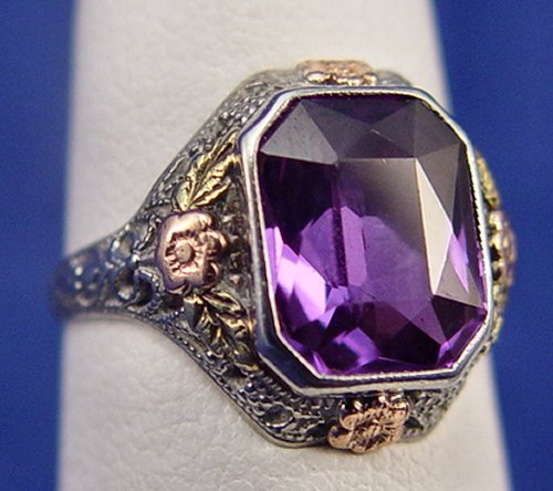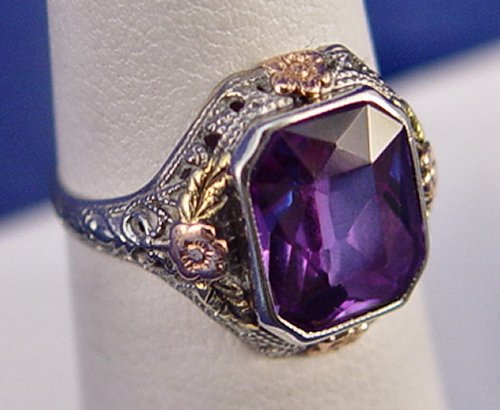 AMETHYST? & 14K TRI COLOR GOLD RING: Filigree mounting of white gold decorated with rose and yellow gold flowers, bezel set with a square cut amethyst? measuring approx. 9.8 x 8 x 4.3mm, maybe this is another color change sapphire. Size 4.75, 2.3 grams.