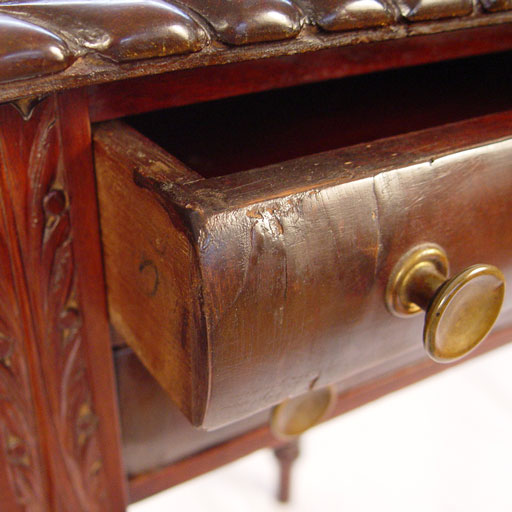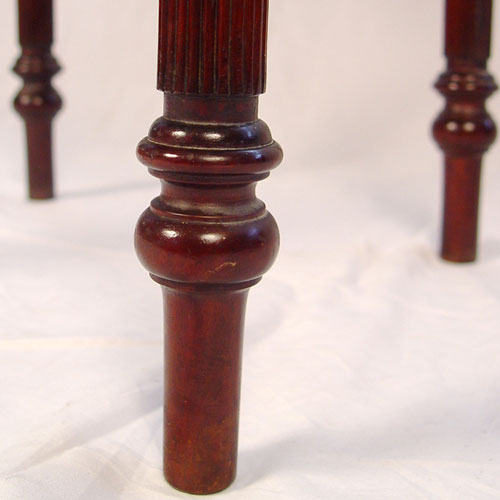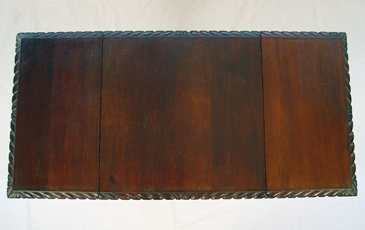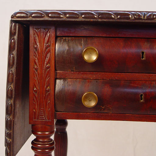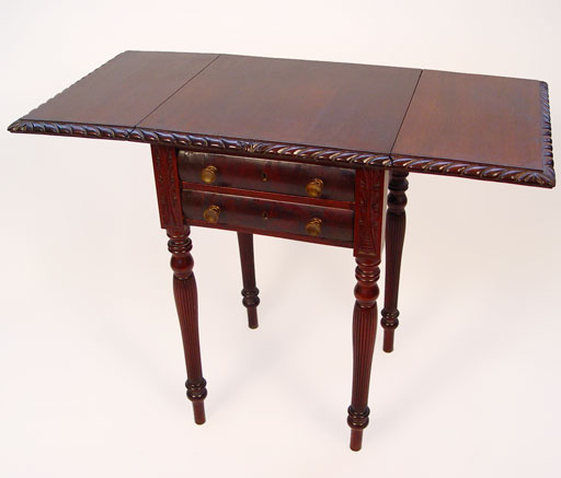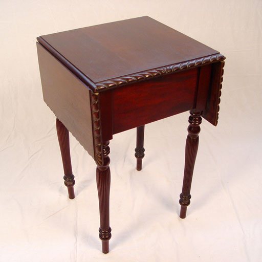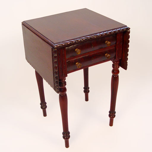 CARVED MAHOGANY DROPLEAF WORK TABLE: Late 19th C. Two ogee drawers with brass pulls, drop leaves edged in gadroon carving, four fluted legs. 28 1/2''h. x 18'' x 18''. Leaves extend the top to 37''.