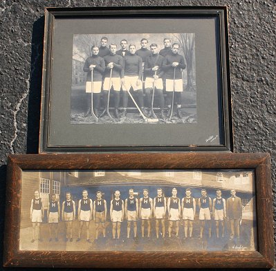 PR EARLY PHOTOS: Early Harvard Track team photo (10 1/2'' x 18 1/2'' in worn tiger oak frame) by a Boston Photography studio, illegibly signed, and an early hockey team photo by Pach Bros. (9 1/2'' x 12 1/4'', 15 1/2'' x 18 1/2'' with period frame.)
