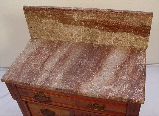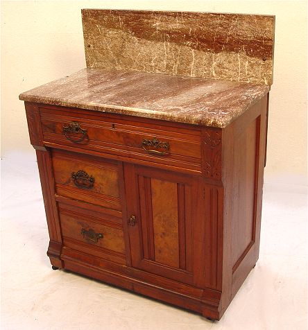 MARBLE TOP VICTORIAN WASHSTAND: One drawer over two drawer by one door base, all pulls are unique, brown variegated marble top and backsplash attached to base by screws. 29 1/2''w. x 17''deep, top 29 1/2''h., 38 1/2'' to top of backsplash.